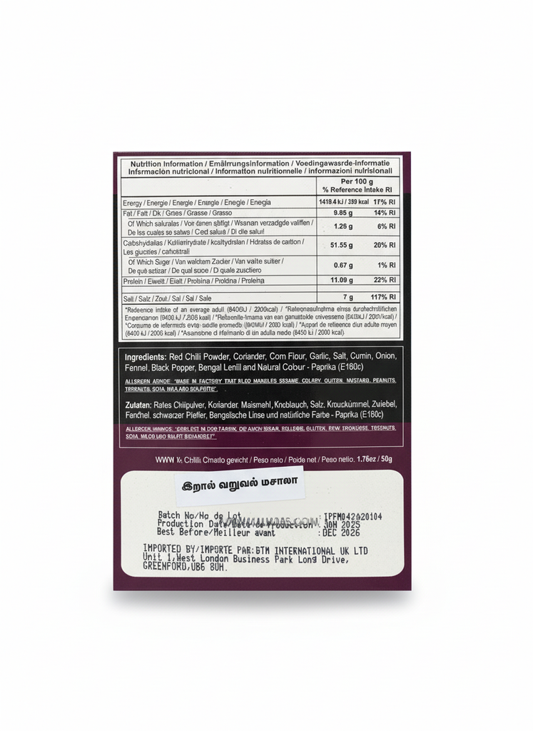 Aachi Prawn Fry Masala a spice blend to prepare prawn fry, bringing the authentic taste of Indian cuisine to your kitchen. Check the pack for ingredient and allergen details before use. Store in a cool, dry place and consume before the expiry date. Presented in a 50g pack, ideal for seasoning prawns with rich flavour.