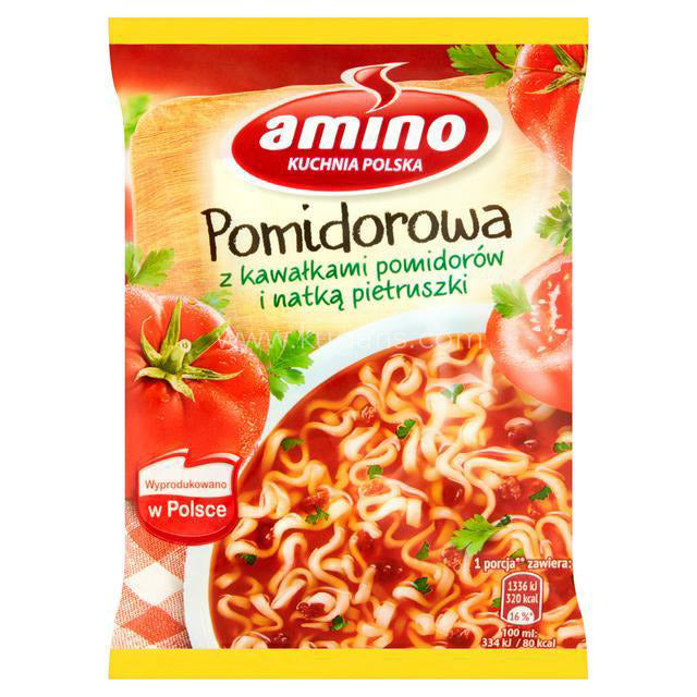 Chinese soup Amino Tomato. Instant tomato soup with pieces of tomatoes and parsley