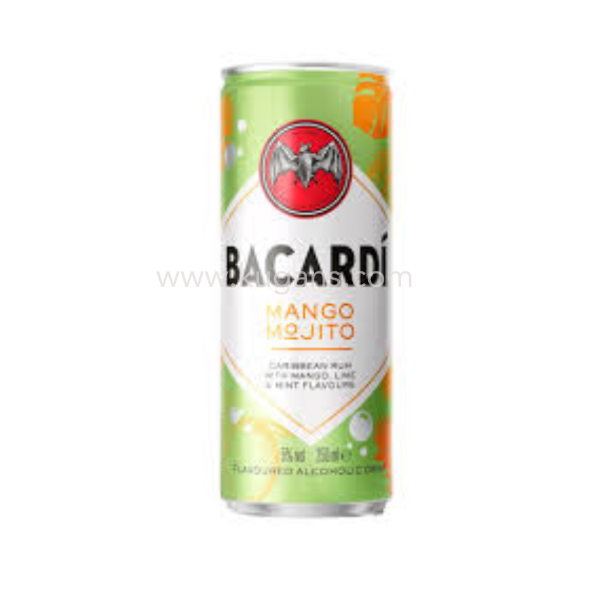 Bacardi Mango Mojito 250 ml is a vibrant, ready-to-drink canned cocktail blending Bacardi Carta Blanca Superior White Rum with luscious mango, refreshing mint, and zesty lime, lightly carbonated for a crisp, tropical twist