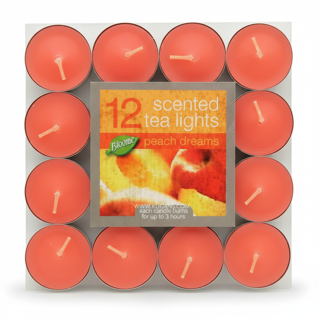 Bloome Peach Dreams Scented Tea Lights fill your space with a soft, fruity aroma and a gentle glow. The warm peach fragrance and coral-toned wax create a welcoming mood for relaxing nights, dining, or bath-time ambience. Each candle burns for up to 3 hours. For safe use, place each tea light in a suitable heat‑resistant holder on a stable, non‑flammable surface, keep the wick trimmed to about 5 mm, position away from drafts and flammable materials, space candles at least 10 cm apart, never leave unattended, and keep away from children and pets.