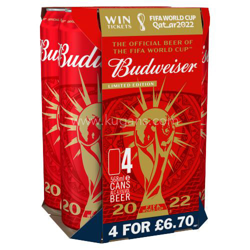Budweiser Beer 568ml 4 Pack offers the classic smooth, crisp, and refreshing taste of Budweiser in larger pint-sized cans. Perfect for sharing, parties, or enjoying a premium lager experience at home.