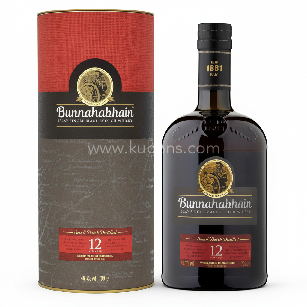 Bunnahabhain 12 Year Islay Single Malt Scotch Whisky is small batch distilled and presented at 46.3% vol in a 70cl bottle. For customers aged 18+ only. Drinking is Injurious to health. The label states natural colour and unchillfiltered and indicates product of Scotland. Supplied in a presentation tube, 70cl.