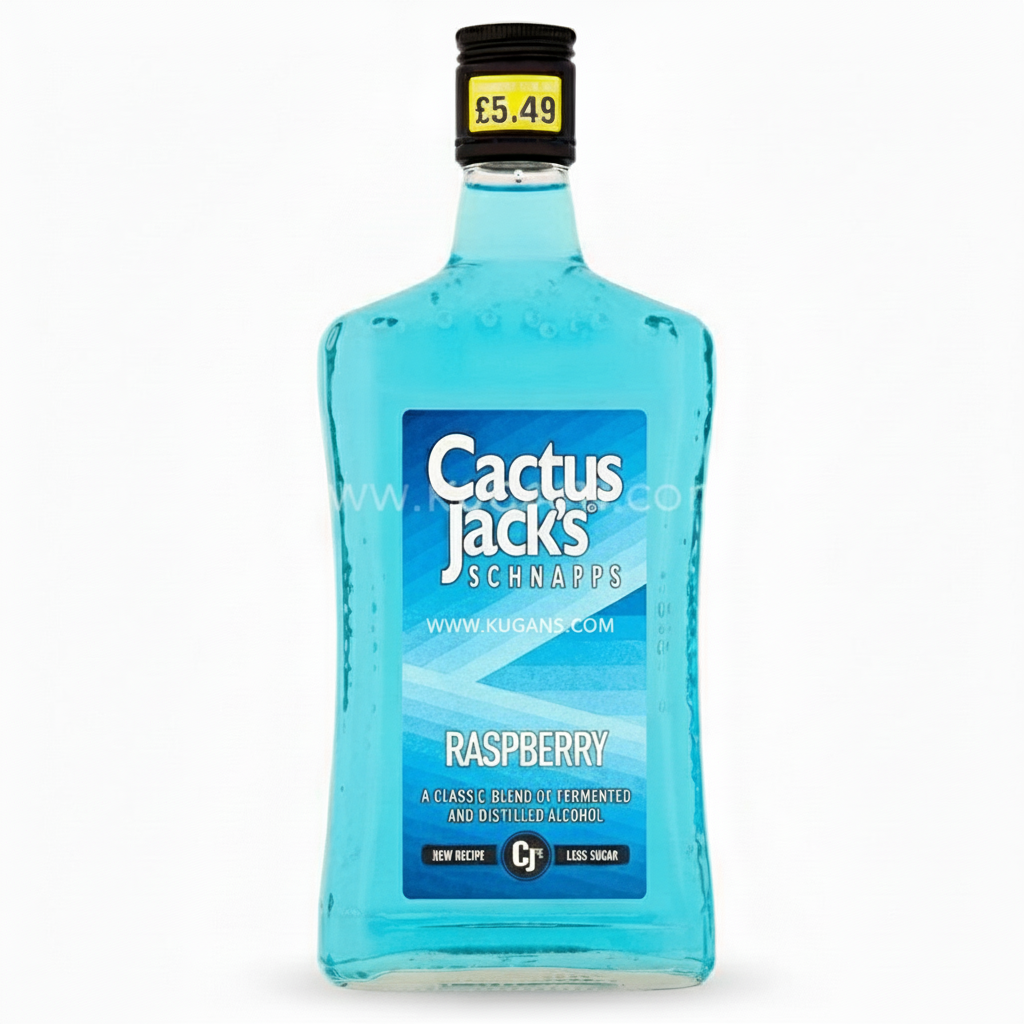 Cactus Jack's Raspberry Schnapps is a raspberry-flavoured schnapps liqueur in a 50cl bottle. It is described on-pack as a classic blend of fermented and distilled alcohol. For customers aged 18+ only. Drinking is Injurious to health. Supplied in a 50cl pack.