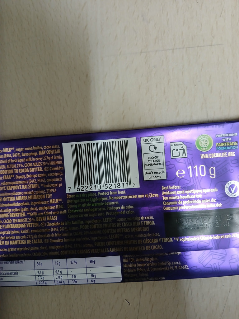 Cadbury Dairy Milk Chocolate is made with the finest ingredients, including fresh milk and delicious cocoa. The result is a velvety smooth chocolate bar that melts in your mouth, delivering a rich and luxurious taste experience.Each bite of Cadbury Dairy Milk Chocolate offers a perfect balance of sweetness and creaminess. Whether you enjoy it on its own, share it with friends and family, or use it as an ingredient in your favorite desserts, Cadbury Dairy Milk Chocolate is sure to bring a moment of pure chocolate bliss.