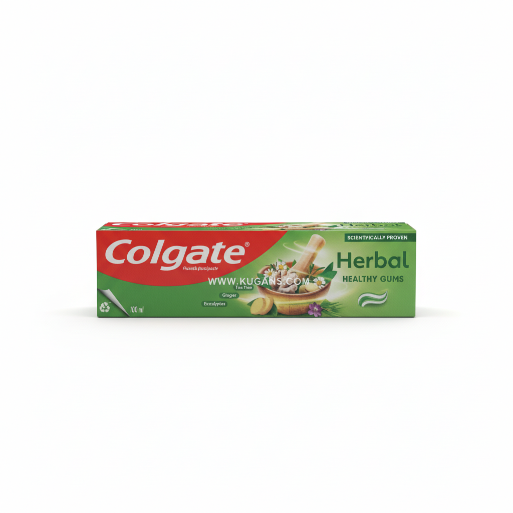 Colgate Herbal Healthy Gums toothpaste is designed to clean teeth and care for gums with a refreshing herbal sensation. The pack highlights herbal ingredients including ginger, tea tree and eucalyptus. For best results, brush thoroughly for two minutes, twice daily, preferably after meals. Spit out after brushing; do not swallow. Use a pea‑sized amount for children over 6 years and supervise brushing. Compatible with both manual and electric toothbrushes, it helps maintain oral hygiene and fresh breath as part of a regular routine.
