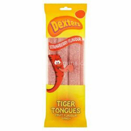 Dexters Tiger Tongue Strawberry - Strawberry Tiger Tongues made by Dexters are a fizzy fruit candy belt with a strawberry flavour.