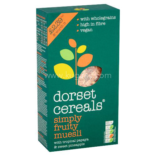 Dorset Simply Fruity Muesli 410g is a wholesome blend of toasted wholegrain flakes and naturally sweet dried fruits. Packed with papaya, sultanas, raisins, and pineapple, this high-fibre cereal delivers a fruity, satisfying start to your day.