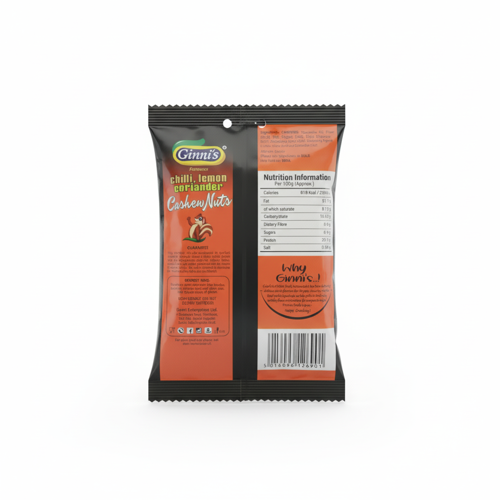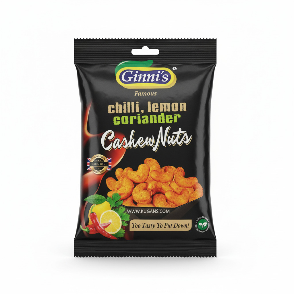 Ginni Cashews Chilli Lemon & Coriander. Super Delicious and Crunchy. They are perfect for snacking and ideal for taking out and about with you. There's so much flavour packed into one bag!