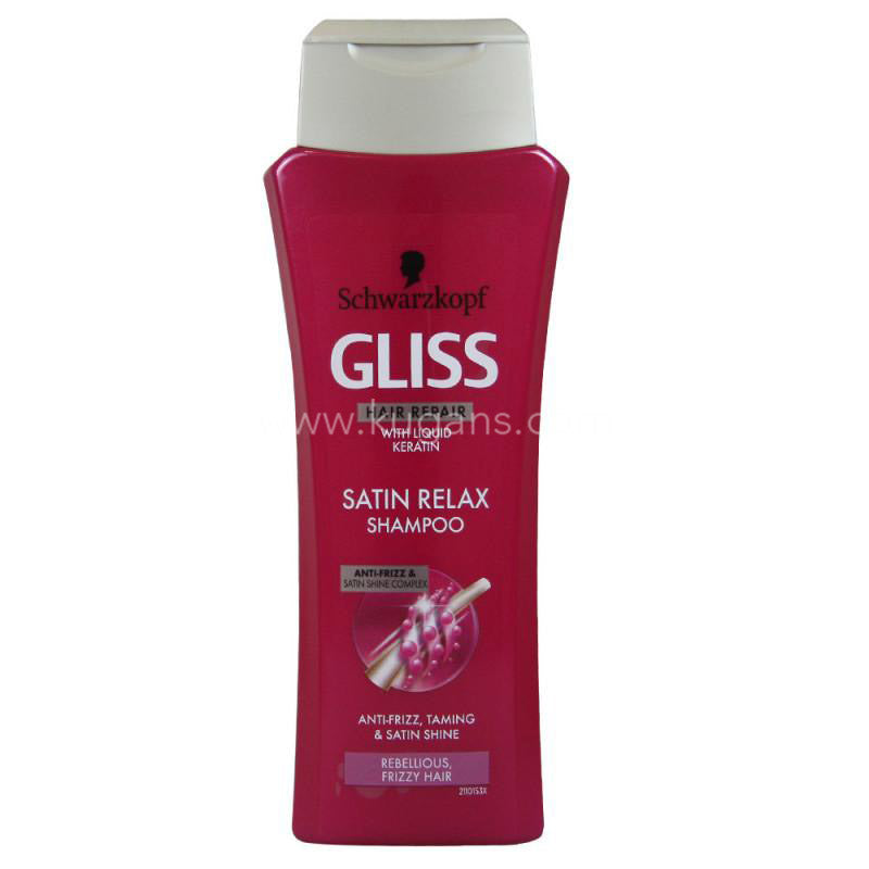 Gliss Shampoo Satin Relax. Shampoo for unruly, dry hair; With liquid keratin complex; Anti-frizz and satin shine complex; Combability and the ANTI-FRIZZ COMPLEX within the creamy-foamy shampoo formula relaxes the hair structure, making it smoother and shinier - for visibly tamed hair.