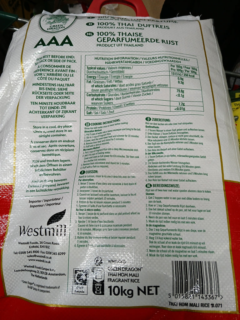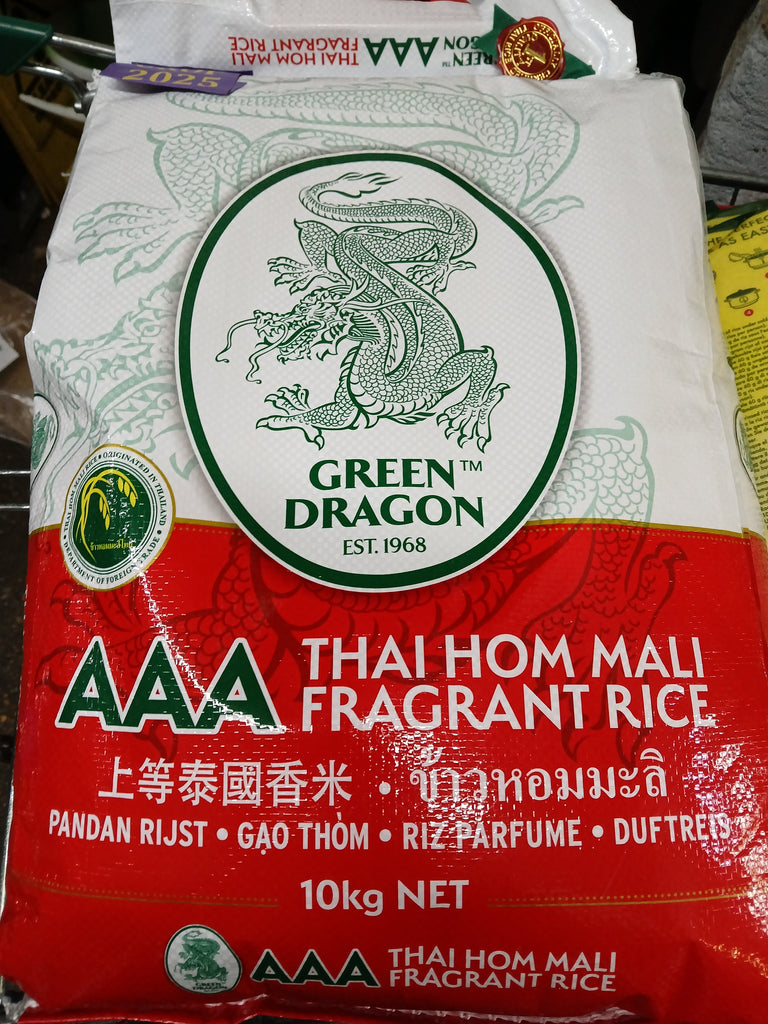 Green Dragon Thai Rice 10Kg. reen Dragon 100% Thai Hom Mah Fragrant Rice 10kg STORAGE: Cool dry place, once opened a store in an airtight container. No preservatives or additives.