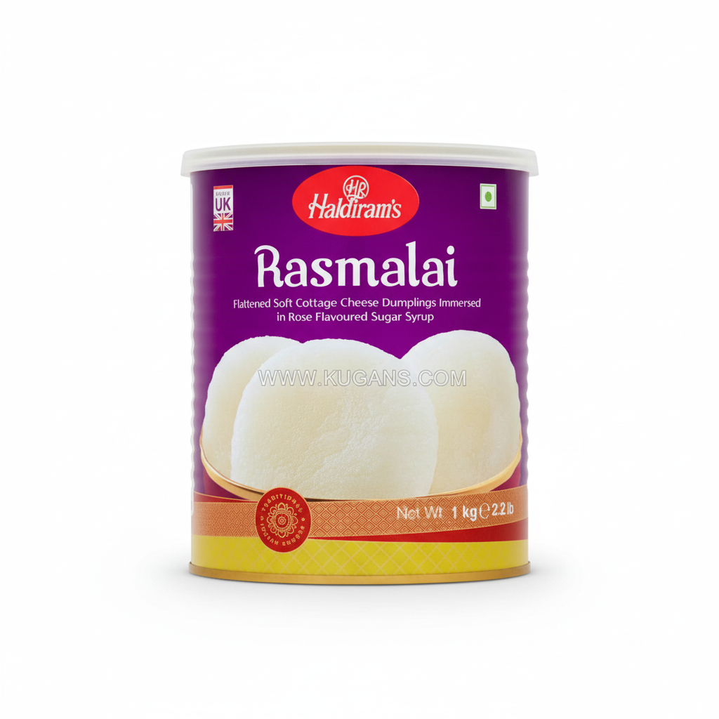 Haldiram's Rasmalai tin with flattened soft cottage cheese dumplings immersed in rose flavoured sugar syrup. Check the pack for ingredient and allergen details before use. Store in a cool, dry place and consume before the expiry date. Net weight 1 kg.