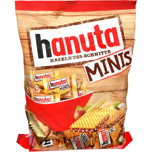 Hanuta Minis are bite-sized versions of the classic Ferrero Hanuta — crisp wheat waffles layered with a creamy filling made from freshly roasted hazelnuts and aromatic cocoa. Each mini is individually wrapped, making them easy to enjoy on the go.