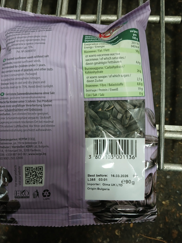 Kerpi’s unsalted roasted sunflower seeds come in a 90 g cardboard box. Made from premium sunflower seeds, they’re dry-roasted to a light crunch and kept completely unsalted—perfect for a healthy, natural snack