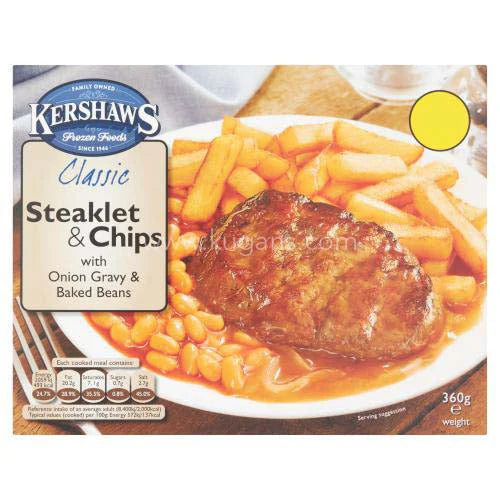 Kershaws Classic Steaklet & Chips is a hearty British-style ready meal featuring a reformed beef and pork steaklet, crispy chips, rich onion gravy, and baked beans in a tomato sauce. This convenient frozen dish is ideal for a quick and satisfying dinner.