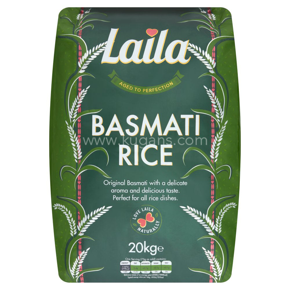 Laila Basmati Rice 20Kg. Basmati Rice is perfect for curries or as an accompaniment to any meat, vegetable or fish dish. Original basmati with a delicate aroma and delicious taste. Our rice is perfect for many dishes. Naturally gluten-free.