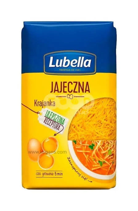 This 250g pack of Lubella Jajeczna Krajanka is known for its fresh egg pasta, crafted from high-quality durum wheat and real eggs. Ideal for soups, casseroles, or traditional Polish recipes, this pasta cooks to a tender and flavorful texture, providing a rich and authentic taste experience.