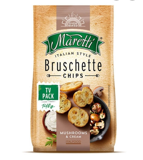 Maretti Fine Cheese Bruschette Chips are oven-baked bite-sized bread crisps from Bulgaria, inspired by classic Italian bruschetta. Light and crunchy, each round is generously seasoned with a rich mixed‑cheese blend—ideal for snacking or pairing with dips and cheese toppings