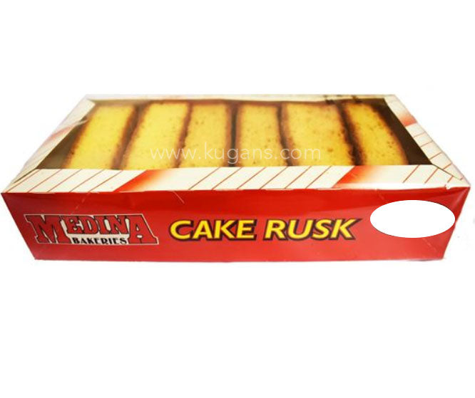 Medina cake rusk is a hard, dry biscuit or a twice-baked bread. It is sometimes used as a teether for babies. In some cultures, rusk is made of cake, rather than bread: this is sometimes referred to as cake rusk.