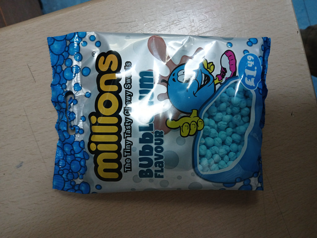 Millions are ultra-small, chewy bubblegum-flavored sweets from the UK—little candies packed with explosive bubblegum taste. This 110 g hanging bag is designed for convenient snacking and sharing, ideal for candy lovers on the go