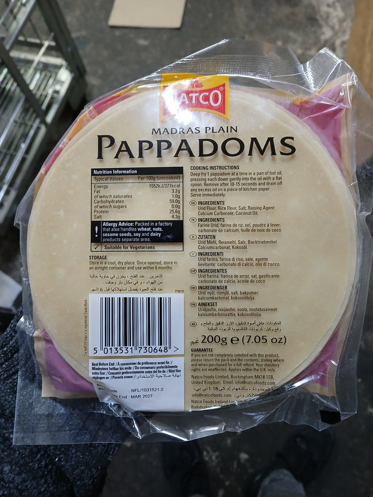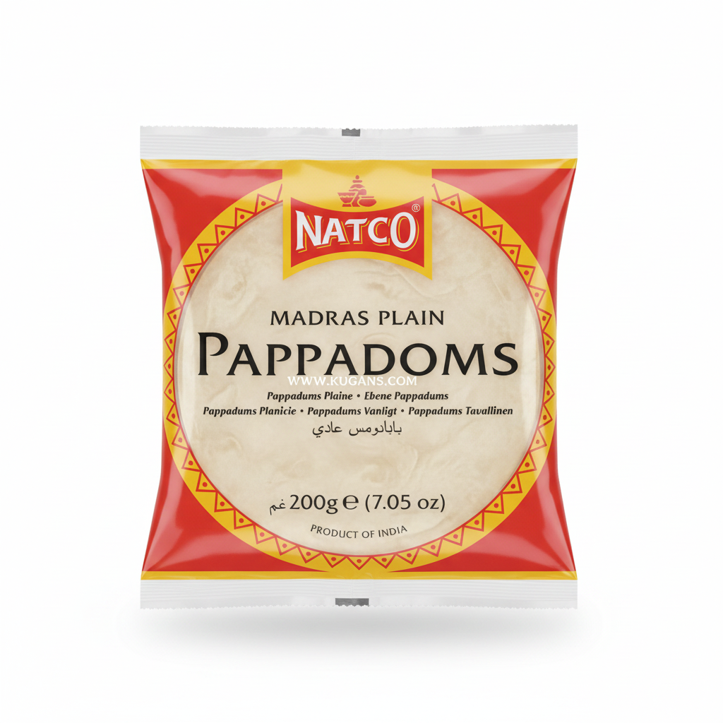 Natco Madras Pappadoms 200g are crispy, thin, and light snack crackers made from a traditional blend of rice flour, lentils, and spices. They have a distinctive, aromatic flavor with a mild heat from chili and other spices, capturing the essence of South Indian cuisine. Made with high-quality, simple ingredients and free from artificial preservatives, these pappadoms offer a deliciously crispy and flavorful addition to any meal.