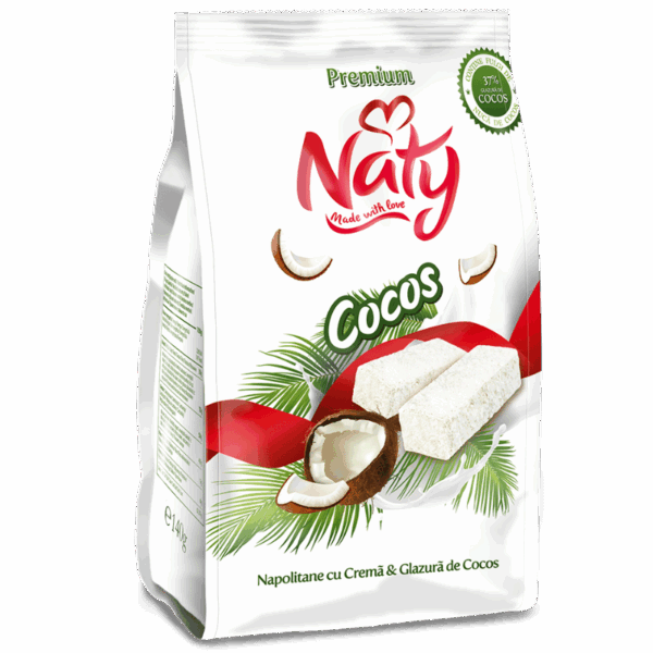 Naty Cocos son napolitanas rellenas con un 46% de crema de coco y cubiertas con un 37% de glaseado de coco, presentadas en paquetes de 140 gramos