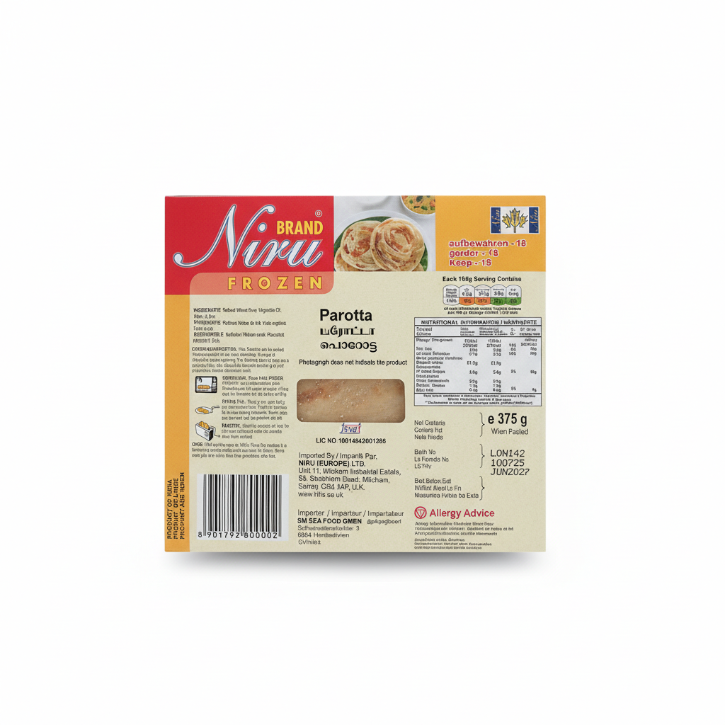 Produced by Niru in India, this vegetarian parotta carries printed claims of 100% natural and no preservatives. It is convenient for home kitchens, quick family dinners, or late-night snacks. Store frozen as indicated on pack: Keep -18. Pair with vegetable kurma, paneer butter masala, or spicy salna. Buy Niru Parotta Ready To Eat to enjoy authentic, layered parotta whenever you crave it.