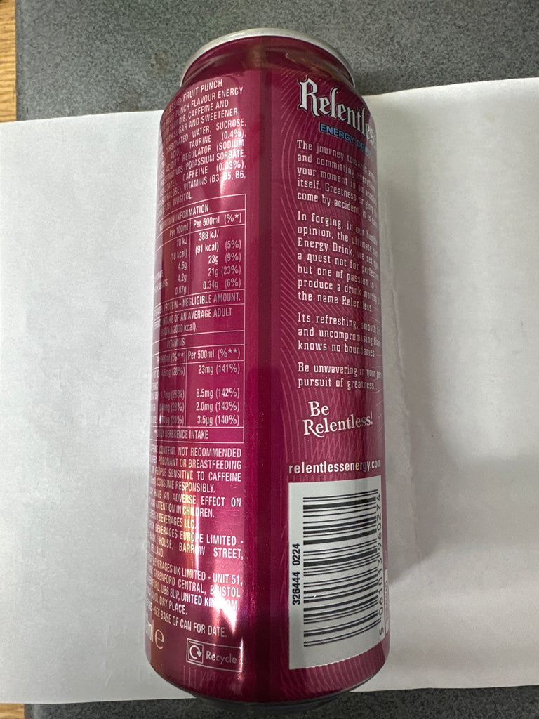 This 330ml can of Relentless Fruit Punch delivers a bold and energizing blend of tropical fruit flavors. Enriched with caffeine, taurine, and B-vitamins, it provides a powerful boost of energy, focus, and stamina whenever you need it.