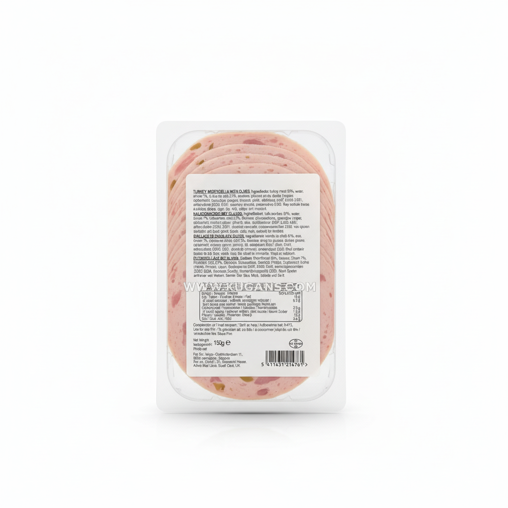 Shaia Turkey Mortadella with Olives is a ready-to-eat turkey cold cut, finely sliced and studded with green olive pieces for a mild, savoury bite. Simply peel back the film, separate the slices and serve chilled in sandwiches, wraps, and salads. For a warm option, place slices briefly in a pan or toastie maker for 30–60 seconds, or add to pizzas and bakes near the end of cooking to gently heat without drying.