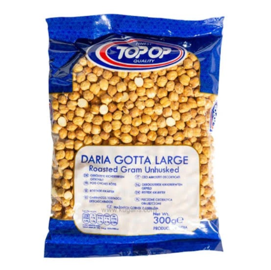 Top Op Daria Gotta Large 300g is a high-quality variety of chickpea product, known as Daria Gotta or split chickpeas. This pack contains larger-sized, carefully processed chickpeas, which offer a hearty texture and rich flavor, ideal for both savory and sweet preparations in a variety of dishes. Free from artificial colors, flavors, and preservatives. Gluten-Free.
