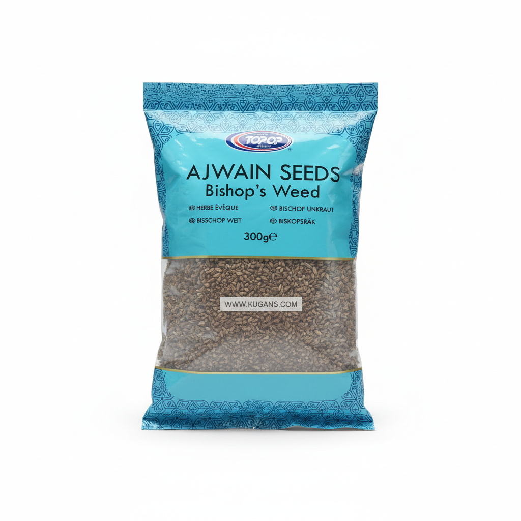 Top Op Ajwain Seeds (Bishop’s Weed) add a bold, thyme-like aroma and peppery warmth to a wide range of Indian dishes. Use them for tadka in pakoras and dals, or to flavour breads and parathas for a distinctive taste. For best results, heat 1–2 teaspoons of oil, add 1/4–1/2 teaspoon ajwain seeds and let them sizzle for 10–20 seconds before mixing into your dish, or lightly roast and grind to blend into doughs and spice mixes. Ingredients: Ajwain Seeds.